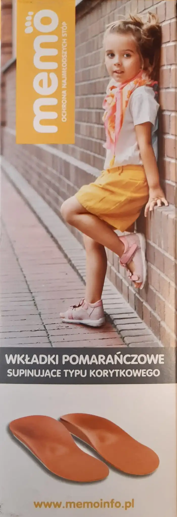 Wkładki ortopedyczne dla dzieci Memo pomarańczowe pełne, to kompleksowe wkładki typu korytkowego, o pełnej długości. Supinują piętę i śródstopie o 10 mm nadając stopie jej prawidłową oś. Korygują ustawienie śródstopia i tyłostopia. Wspomagają prawidłowe kształtowanie wysklepienia podłużnego i poprzecznego stóp. Mają zastosowanie w przypadku koślawości pięt i kolan oraz płaskostopia podłużnego i poprzecznego. Można je stosować w każdym rodzaju obuwia.