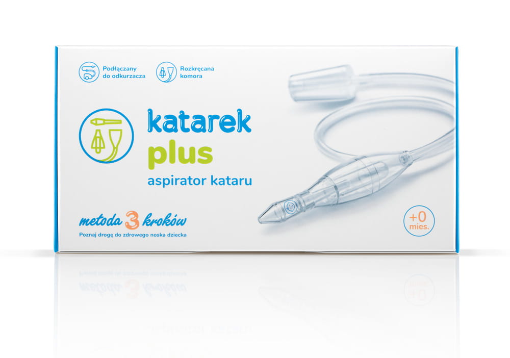 Katarek plus - aspirator kataru Przyrząd służy do szybkiego i skutecznego usunięcia zalegającej wydzieliny z nosa niemowlęcia. Bezpiecznie opróżnia nos i przynosi ulgę w oddychaniu. Katarek plus jest podłączany do odkurzacza, a zredukowana, jednostajna siła ssąca ma ogromną przewagę nad aspiratorami ustnymi czy gruszkami. Jest higieniczny – zbiorniczek gromadzący odessaną wydzielinę jest rozkręcany, łatwo go umyć. Zestaw zawiera aspirator z rozkręcaną komorą, dwie końcówki z identyfikacja "JA&TY" oraz szczoteczkę z wytrzymałym włosiem do czyszczenia zbiorniczka. Odsysacz jest odpowiedni do odkurzacza o mocy 800-1800W.