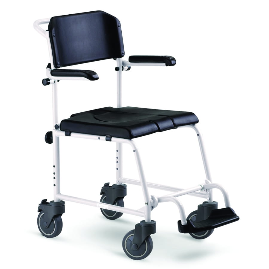 NIEMIECKI WÓZEK PRYSZNICOWO-TOALETOWY MCWET wykonany jest w całości z niekorodującego aluminium i stali nierdzewnej. Przeznaczony do kontaktu z wilgotnym środowiskiem, np. pod prysznicem. Siedzisko jest wyprofilowane anatomicznie z otworem higienicznym, umożliwiającym załatwienie potrzeb fizjologicznych. Wózkiem można najechać nad muszlę klozetową lub w jako opcja zainstalować pojemnik na nieczystości. Wózek ma uchylne podłokietniki oraz odchylane podnóżki. Ma także opcje zdjęcia oparcia dla łatwiejszego transportu lub przechowywania wózka. Tapicerka łatwo zmywalna, łatwo utrzymać go w czystości. Maksymalne obciążenie 120 kg.