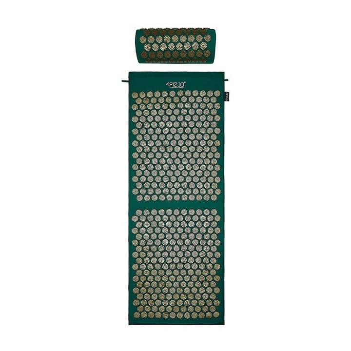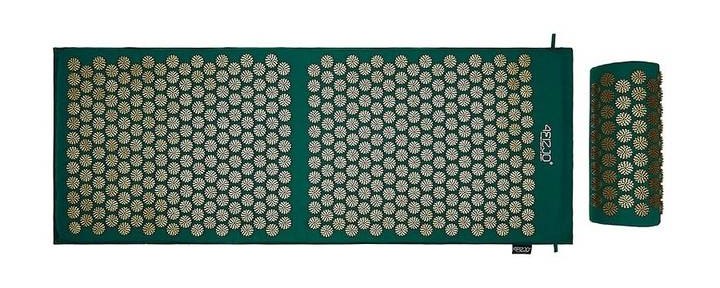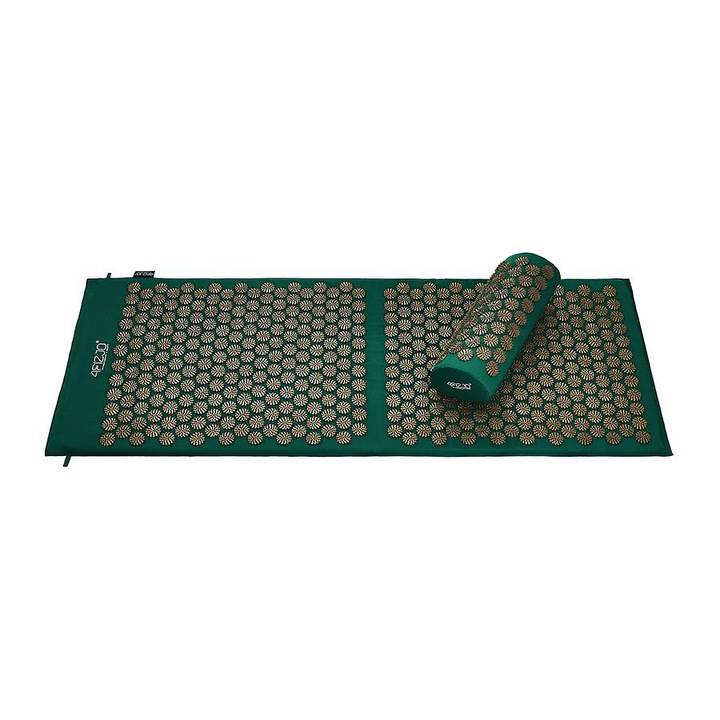 Duża mata rehabilitacyjna do akupresury z poduszką, niwelująca zmęczenie i dolegliwości bólowe, wspomagająca relaksację 110x42 (ZIELONO-ZŁOTA)