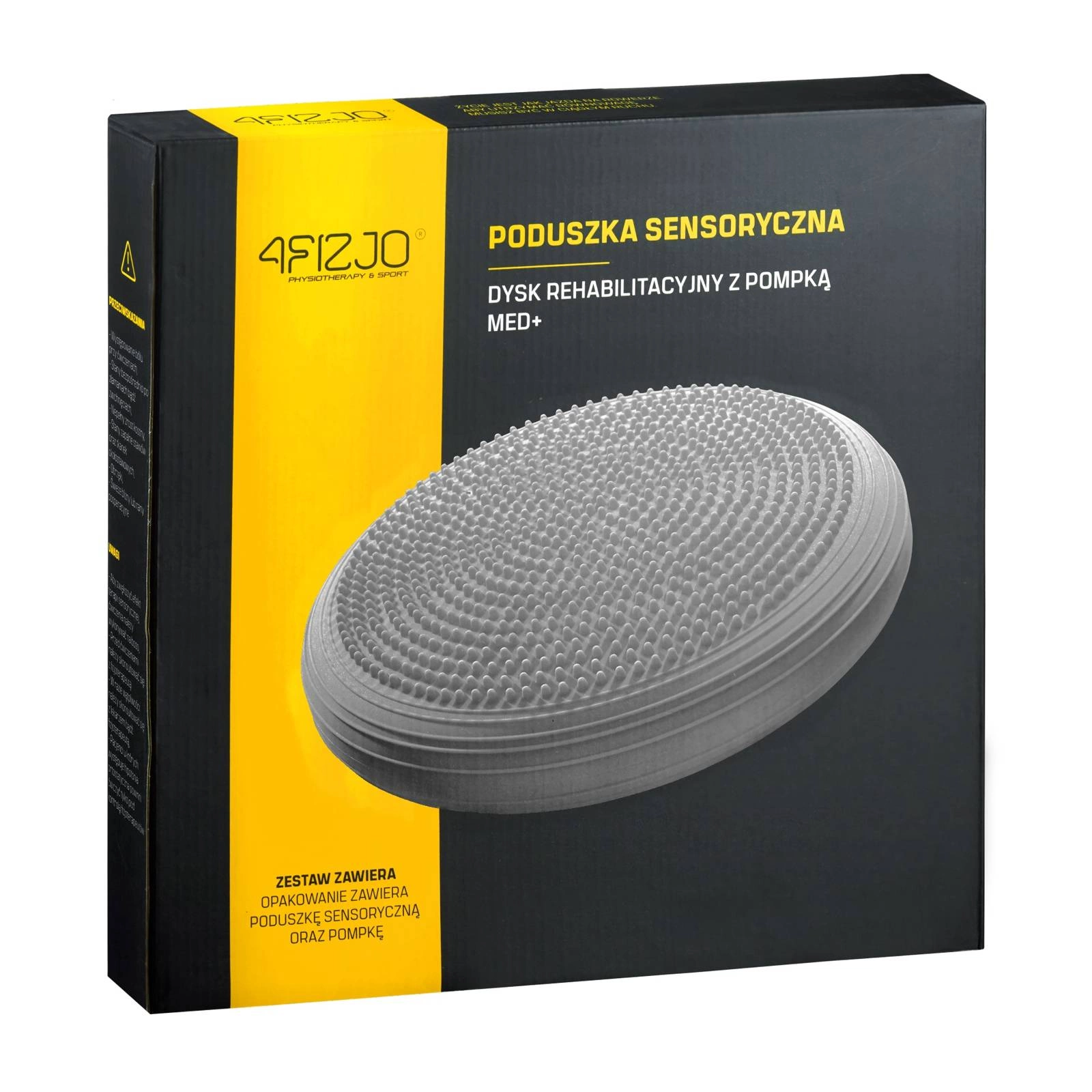Poduszka sensoryczna MED+ przeznaczona jest do treningu stabilizacji, równowagi oraz koordynacji ruchowej. Została wykonana z wysokiej jakości materiału PVC. Posiada dwa rodzaje powierzchni – z jednej strony gładka posiadająca niewielkie wypustki, natomiast z drugiej masująco-stymulująca posiadająca duże wypustki. Jest zarejestrowana w Urzędzie Rejestracji Produktów Leczniczych Wyrobów Medycznych i Produktów Biobójczych, przez co wykazuje się bezpieczeństwem użytkowania. Poduszka przeznaczona jest w szczególności do użytku przez fizjoterapeutów oraz trenerów podczas zajęć jogi czy pilatesu. Dodatkowo poduszka sensoryczna MED+ polecana jest osobom po różnego rodzaju kontuzjach w celu odbudowania stabilizacji i równowagi ciała, a także tym, którzy dużo czasu w ciągu dnia spędzają w pozycji siedzącej.