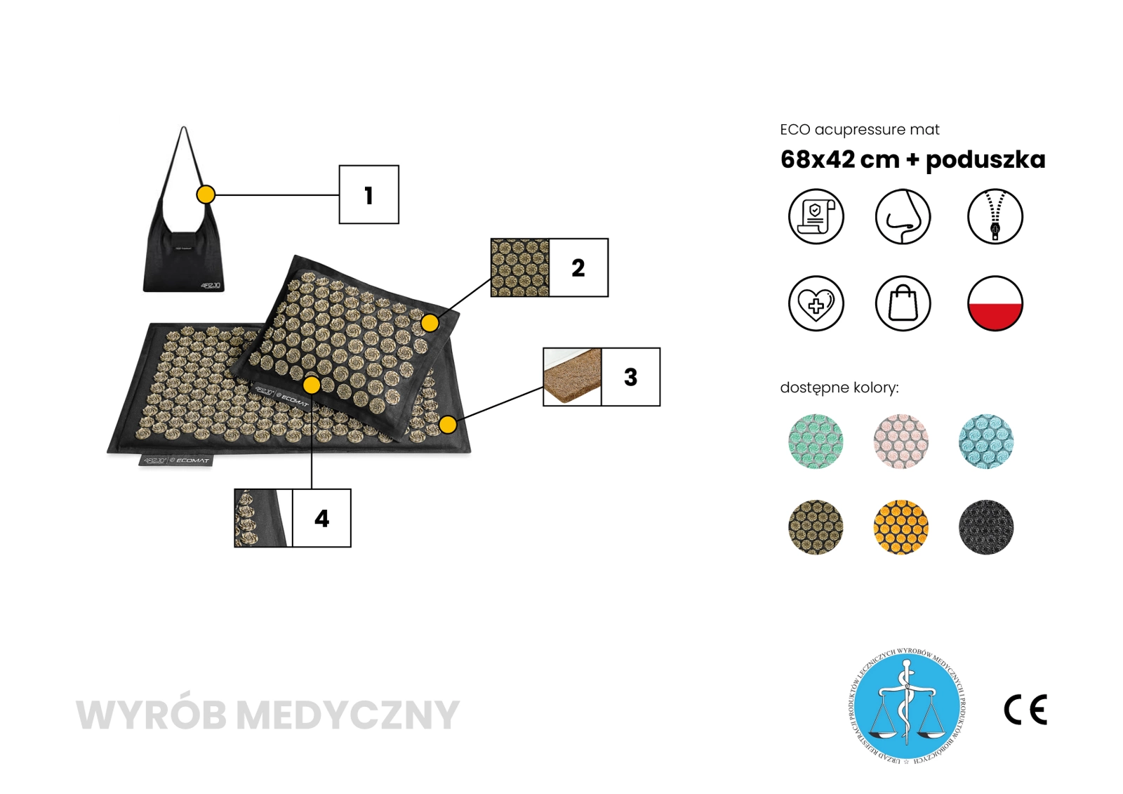 Model Acupressure Eco Mat to jedna z najbardziej poszukiwanych mat do akupresury oferowanych przez markę 4FIZJO. Wyposażona w technologię Spinning Spikes, mata z kolcami stymuluje tkanki do uwalniania endorfin, przynosząc ulgę obolałym mięśniom. Dodatkowo prowadzi do relaksacji całego ciała oraz poprawy ukrwienia mięśni i ich regeneracji. Kolce są przyczepione metodą Heat-Press, co sprawia, że mata jest hipoalergiczna. Wewnątrz znajduje się gruby wkład z naturalnego włókna kokosowego, a pokrowiec jest wykonany w 100% z lnianego materiału, zapewniając przewiewność i świeżość. Poduszka, będąca częścią zestawu, wypełniona jest naturalną łuską gryczaną. Każda mata jest również wyposażona w wygodną torbę na ramię. Mata została zarejestrowana w Urzędzie Rejestracji Produktów Leczniczych Wyrobów Medycznych i Produktów Biobójczych, przez co wykazuje się bezpieczeństwem użytkowania. Kolce oraz tworzywa, z których wykonane są maty są przetestowane i mogą być używane bezpośrednio na gołą skórę.