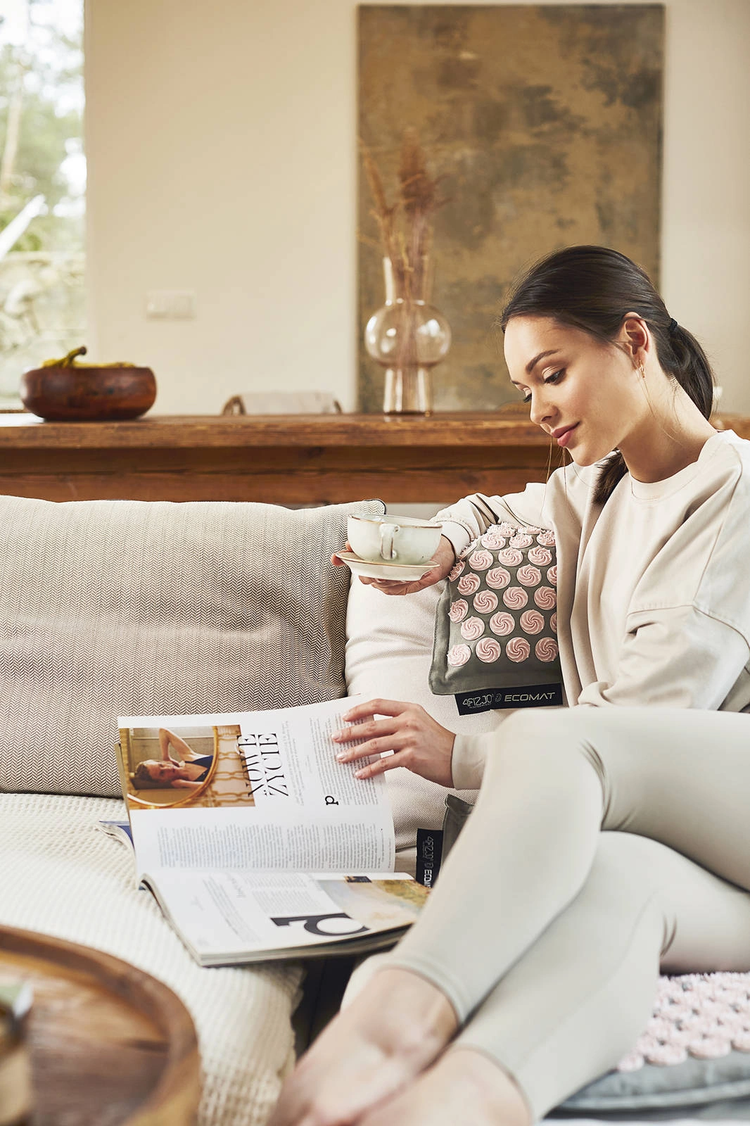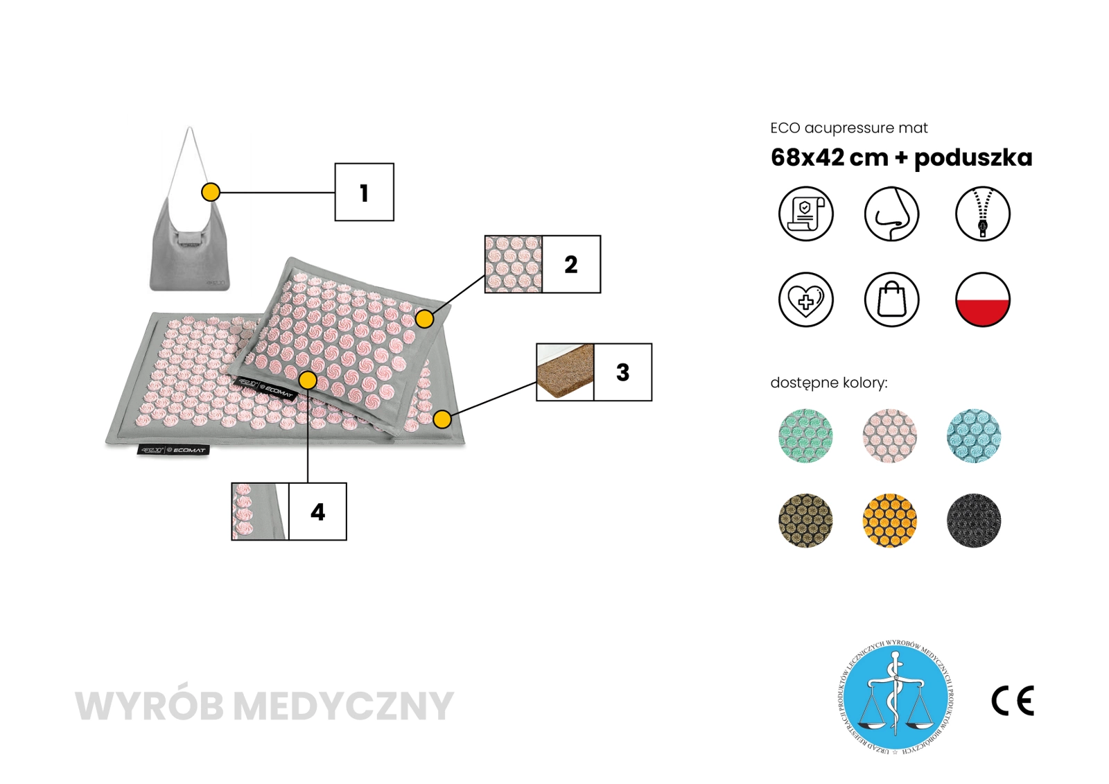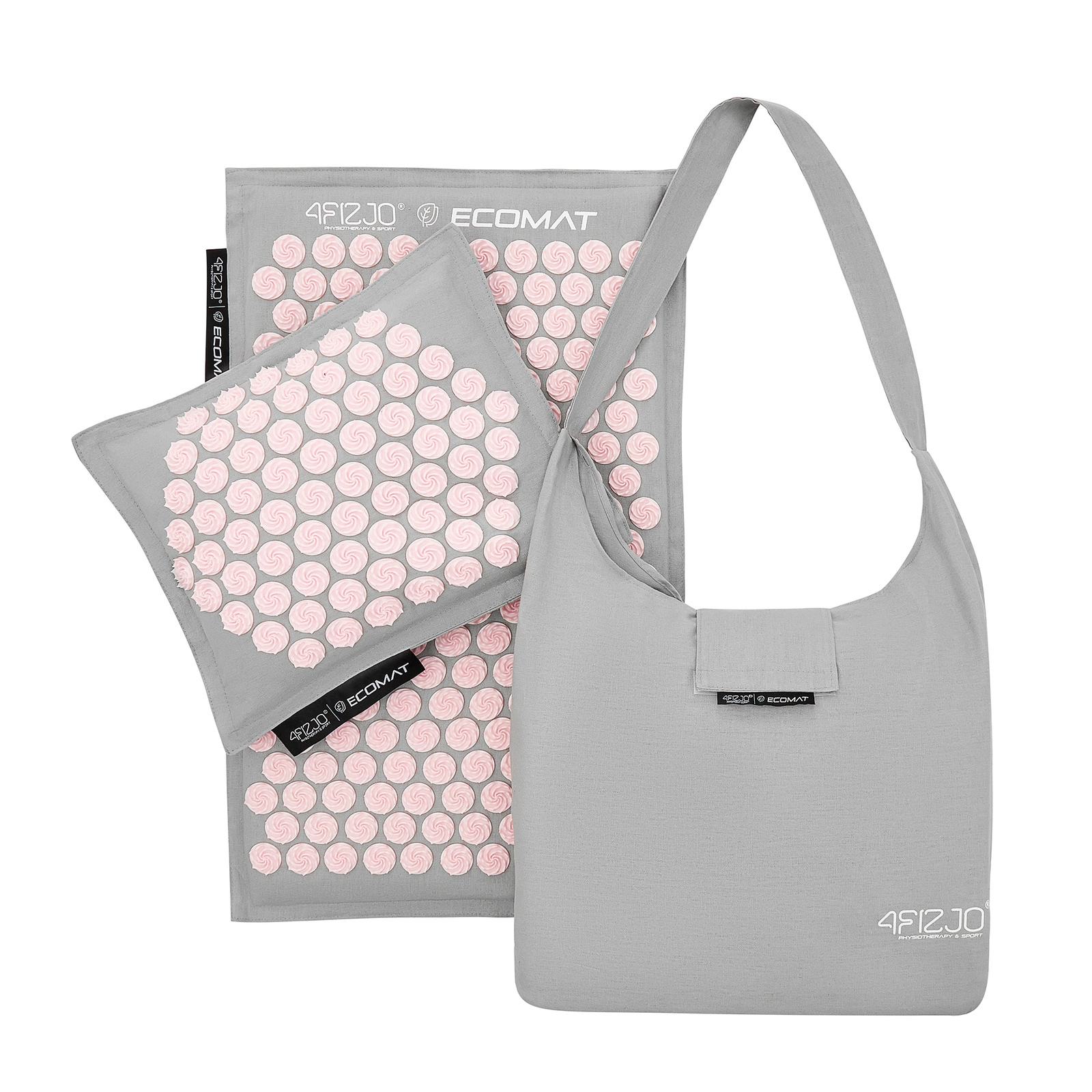 Model Acupressure Eco Mat to jedna z najbardziej poszukiwanych mat do akupresury oferowanych przez markę 4FIZJO. Wyposażona w technologię Spinning Spikes, mata z kolcami stymuluje tkanki do uwalniania endorfin, przynosząc ulgę obolałym mięśniom. Dodatkowo prowadzi do relaksacji całego ciała oraz poprawy ukrwienia mięśni i ich regeneracji. Kolce są przyczepione metodą Heat-Press, co sprawia, że mata jest hipoalergiczna, gdyż nie użyto do jej produkcji żadnych substancji klejących. Wewnątrz znajduje się gruby wkład z naturalnego włókna kokosowego, a pokrowiec jest wykonany z 100% lnianego materiału, zapewniając przewiewność i świeżość. Poduszka, będąca częścią zestawu, wypełniona jest naturalną łuską gryczaną. Każda mata jest również wyposażona w wygodną torbę na ramię. Mata została zarejestrowana w Urzędzie Rejestracji Produktów Leczniczych Wyrobów Medycznych i Produktów Biobójczych, przez co wykazuje się bezpieczeństwem użytkowania. Kolce oraz tworzywa, z których wykonane są maty są przetestowane i mogą być używane bezpośrednio na gołą skórę.