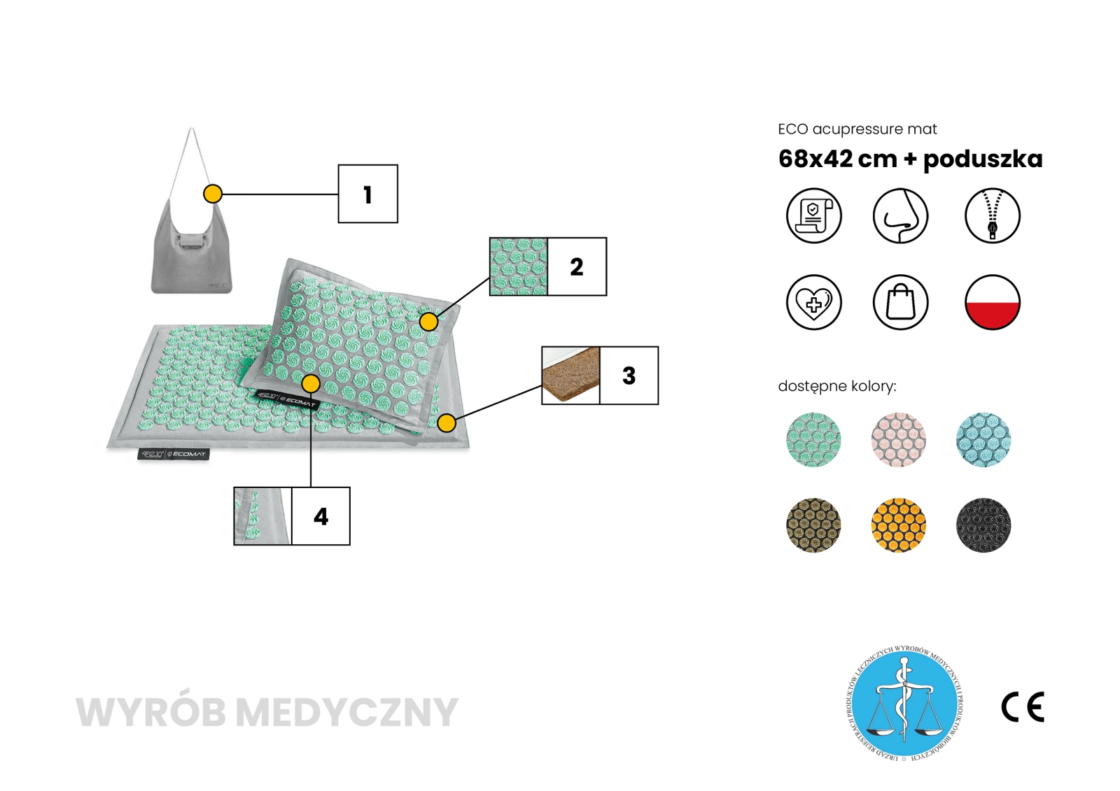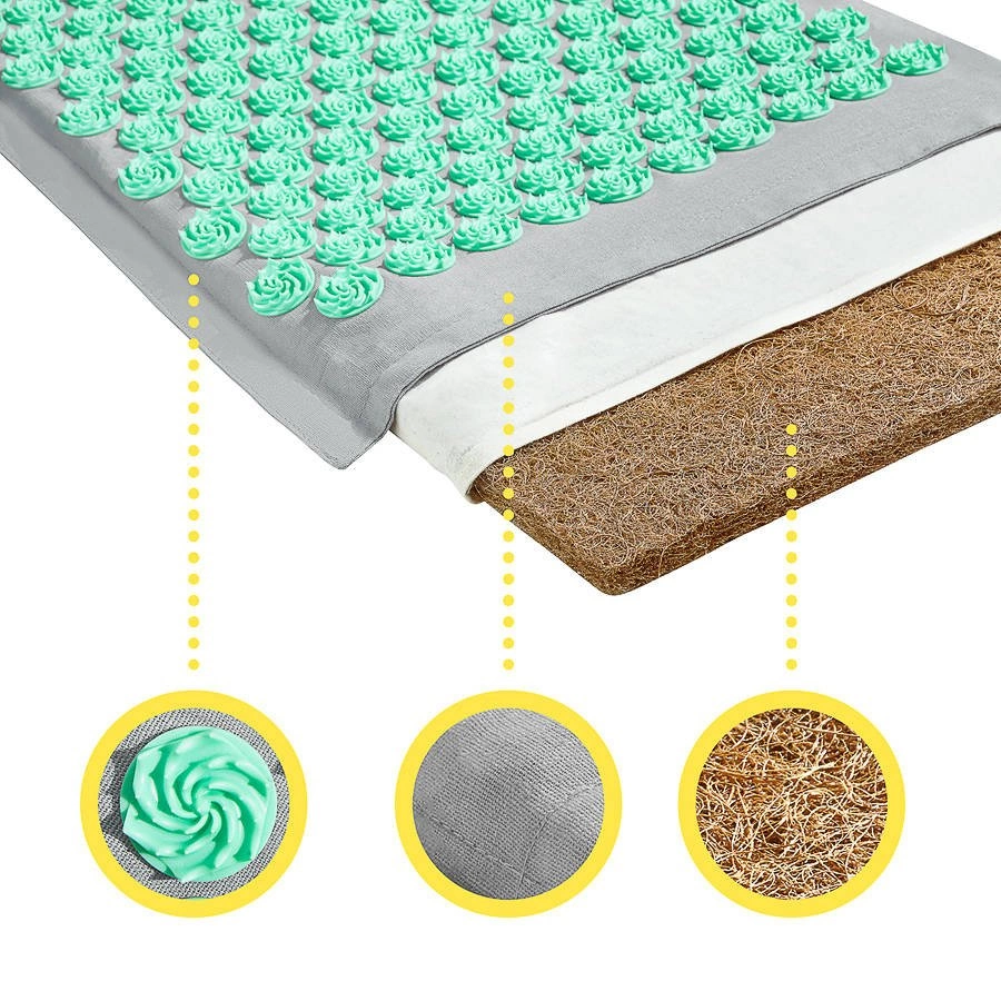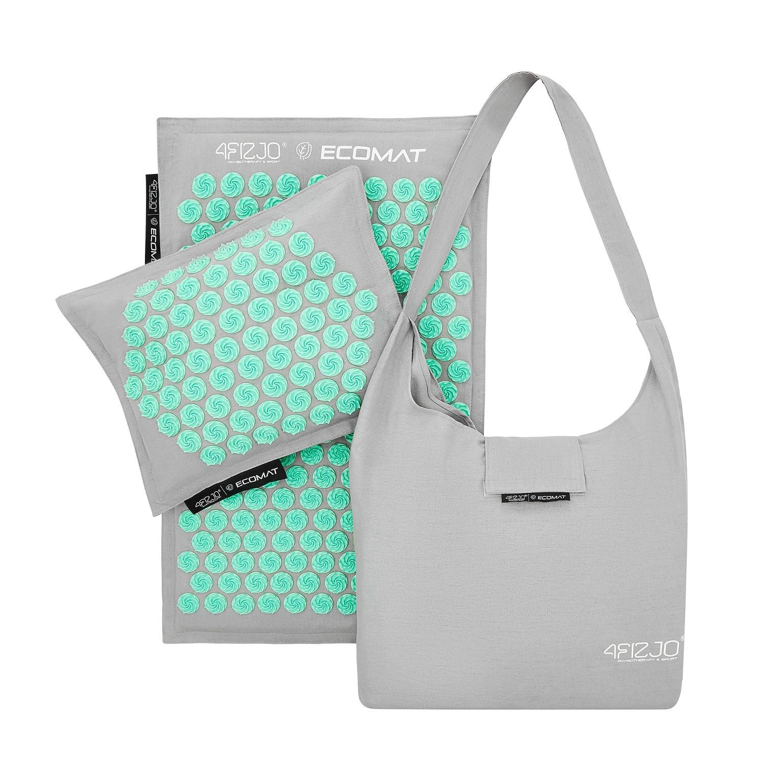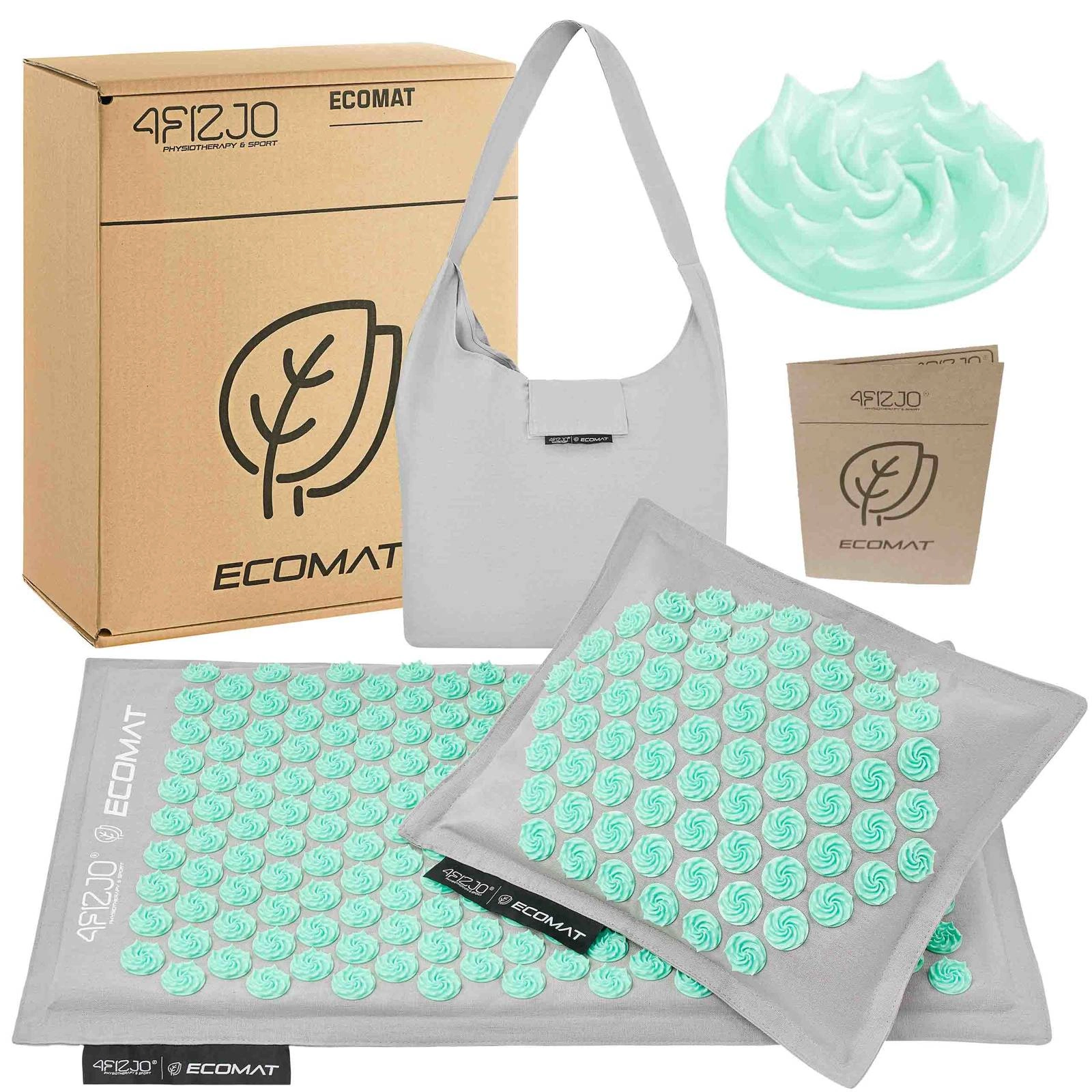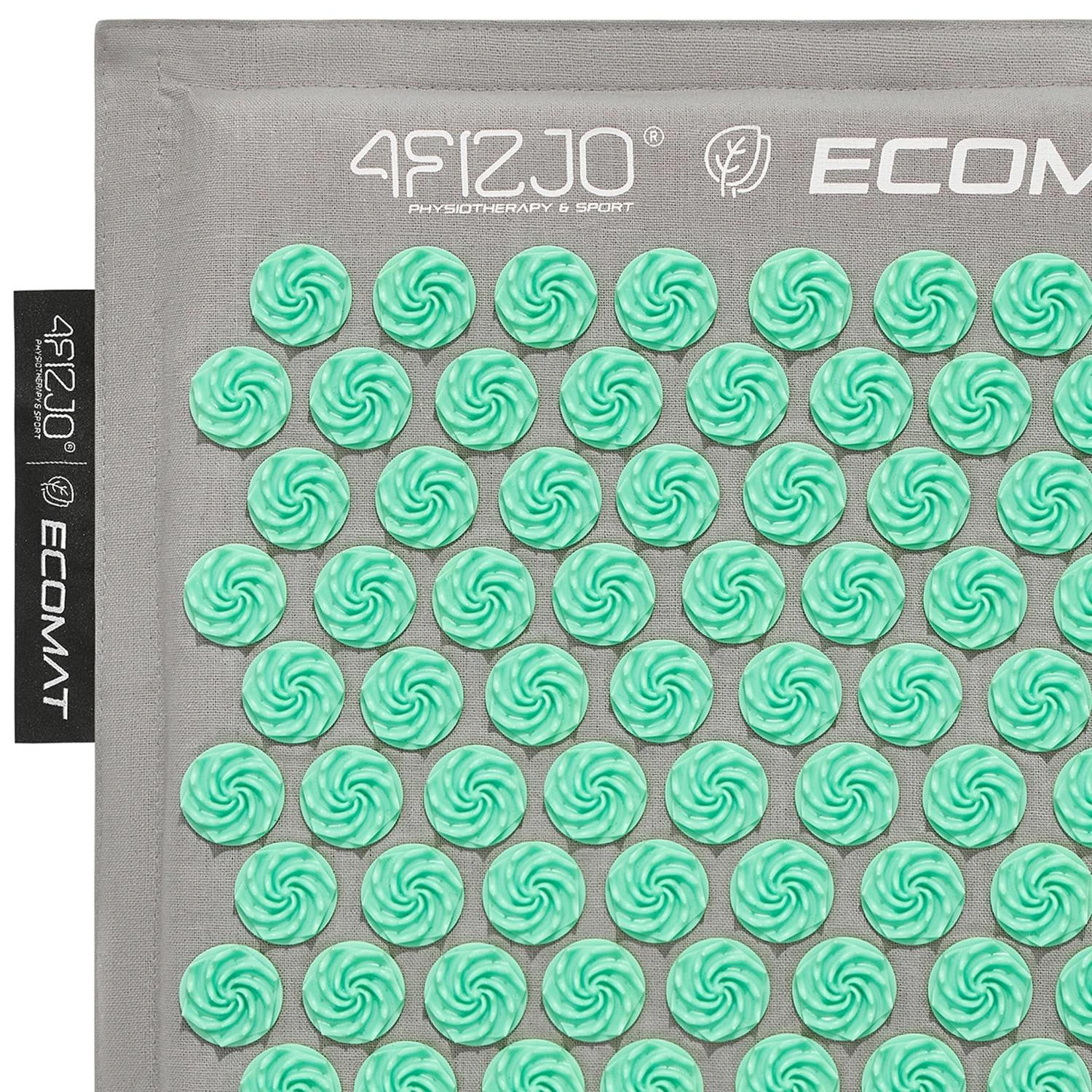 Model Acupressure Eco Mat to jedna z najbardziej poszukiwanych mat do akupresury oferowanych przez markę 4FIZJO. Wyposażona w technologię Spinning Spikes, mata z kolcami stymuluje tkanki do uwalniania endorfin, przynosząc ulgę obolałym mięśniom. Dodatkowo prowadzi do relaksacji całego ciała oraz poprawy ukrwienia mięśni i ich regeneracji. Kolce są przyczepione metodą Heat-Press, co sprawia, że mata jest hipoalergiczna, gdyż nie użyto do jej produkcji żadnych substancji klejących. Wewnątrz znajduje się gruby wkład z naturalnego włókna kokosowego, a pokrowiec jest wykonany z 100% lnianego materiału, zapewniając przewiewność i świeżość. Poduszka, będąca częścią zestawu, wypełniona jest naturalną łuską gryczaną. Każda mata jest również wyposażona w wygodną torbę na ramię. Mata została zarejestrowana w Urzędzie Rejestracji Produktów Leczniczych Wyrobów Medycznych i Produktów Biobójczych, przez co wykazuje się bezpieczeństwem użytkowania. Kolce oraz tworzywa, z których wykonane są maty są przetestowane i mogą być używane bezpośrednio na gołą skórę.