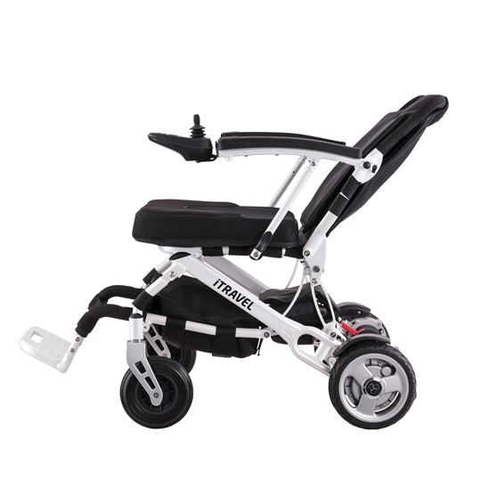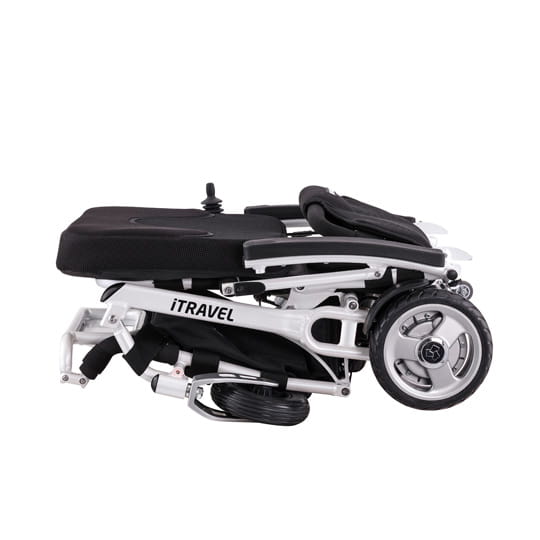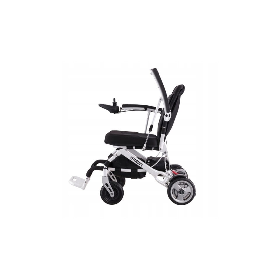Lekki składany wózek inwalidzki z napędem elektrycznym Meyra iTRAVEL 1.054, zarówno do użytku wewnątrz domu jak i poza domem, charakteryzuje się znakomitą zwrotnością, dzięki swoim kompaktowym rozmiarom i składanej ramie jest idealny do każdej podróży