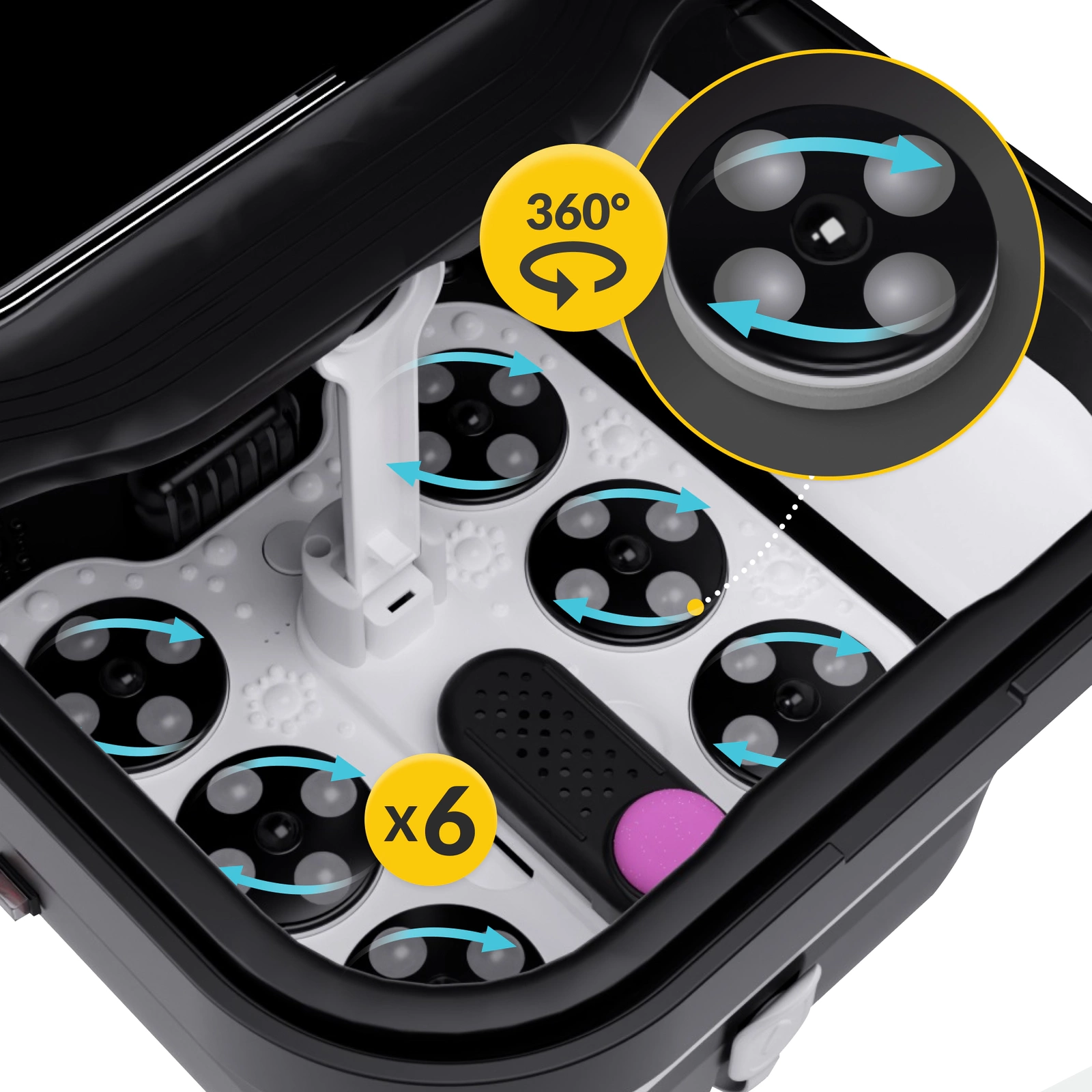 - 6 automatycznych rolek masujących, które precyzyjnie stymulują tkanki stóp i nóg