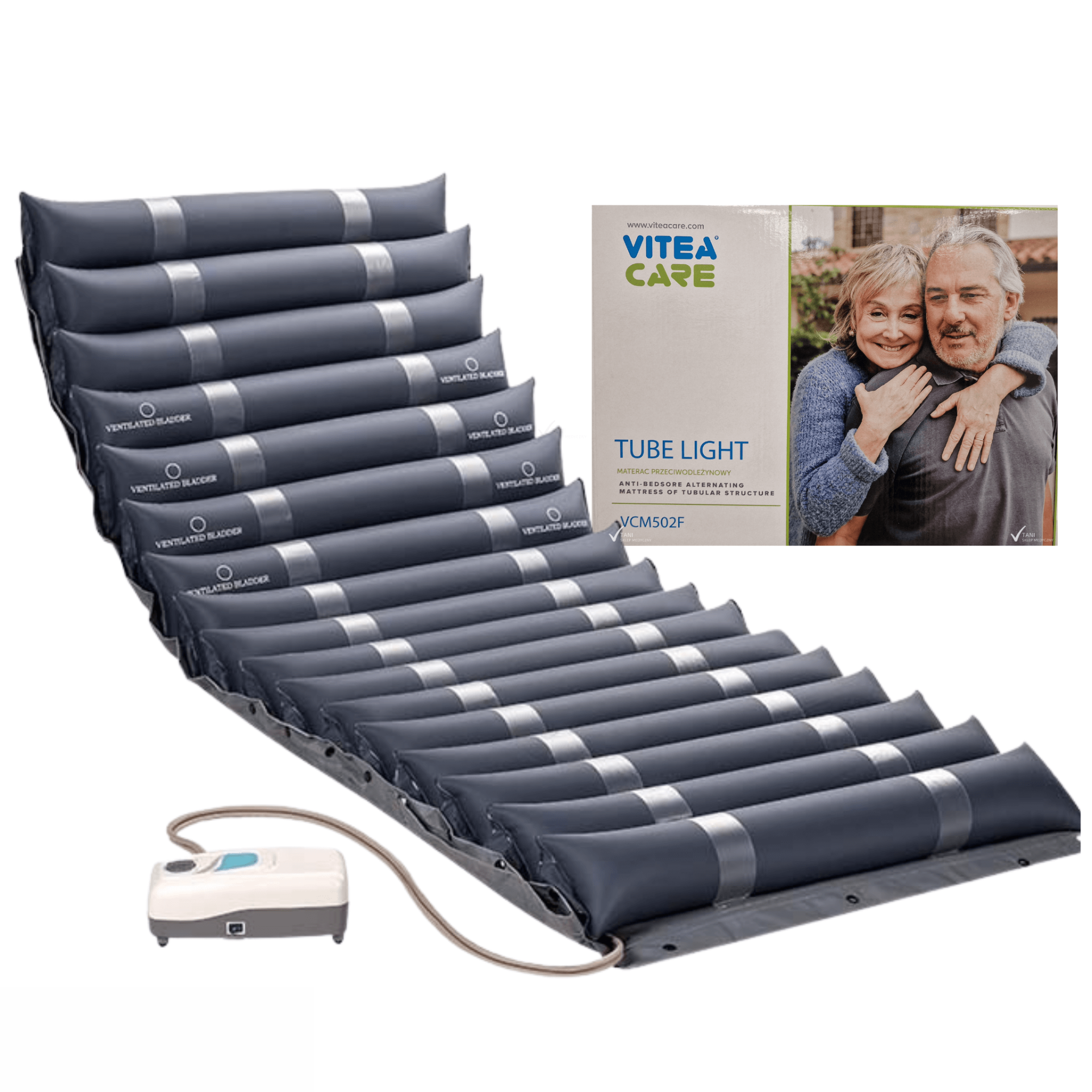 Materac przeciwodleżynowy Tube Light VCM 502F MDH to wyrób medyczny z rurową konstrukcją i mikrowentylacją, zapewniający skuteczną profilaktykę oraz wspomaganie leczenia odleżyn I i II stopnia. Wyposażony w 17 komór naprzemiennie wypełnianych powietrzem, umożliwia regulację ciśnienia i optymalne dopasowanie do pacjenta. System zmiennociśnieniowy, cykl pracy 6 minut oraz zawór CPR gwarantują bezpieczeństwo i komfort w domowej lub szpitalnej opiece długoterminowej.
