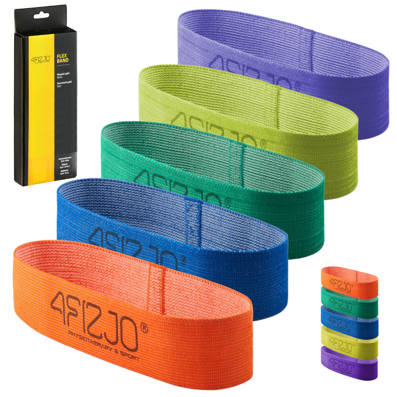Flex Band firmy 4FIZJO to oporowa okrągła taśma do ćwiczeń wykorzystywana w rehabilitacji i treningach sportowych. Opór stawiany przez taśmę ma na celu zwiększenie siły mięśniowej przy jednoczesnej poprawie stabilności ćwiczonych stawów. Wykonana jest z wytrzymałego lateksu pokrytego warstwą materiałową. Daje to wysoką odporność na zerwania i odkształcenia, zapewniając długi czas użytkowania. W trakcie ćwiczeń pozostaje w miejscu, nie przesuwa się, co zdecydowanie wpływa na komfort i jakość treningu. Taśma występuje w 5 kolorach, z których każdy odpowiada konkretnemu oporowi – pomarańczowy (standardowy): 1-5 kg, zielony (średni): 5-10 kg, niebieski (mocny): 10-15 kg, fioletowy (bardzo mocny): 16-22 kg, żółty (ekstremalnie mocny): 23-29 kg. Im bardziej jest rozciągana, tym daje większy opór. Dzięki różnym możliwościom oporowym, taśmy doskonale sprawdzą się zarówno w rehabilitacji, u pacjentów, którzy powracają do pełnej sprawności, u osób amatorsko uprawiających sport, jak i profesjonalnych sportowców. Do użytku w warunkach domowych oraz na siłowniach. Wszystkie taśmy, niezależnie od oporu, występują w jednakowych wymiarach – obwód 68 cm, szerokość 5 cm, grubość 2 mm.