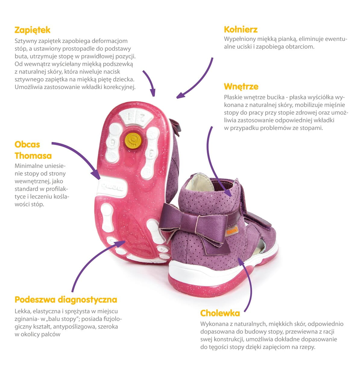 Obuwie zdrowotne dla dzieci stanowi istotny temat, którego znaczenie dla rozwoju najmłodszych nie może być lekceważone. Buty pełnią znaczącą rolę nie tylko w zapewnieniu komfortu i wygody, ale również w prawidłowym rozwoju stóp oraz całego układu kostno-mięśniowego. Buciki Memo to obuwie zdrowotne pełniące funkcję profilaktyczną, zapobiegając przede wszystkim rozwojowi wad postawy oraz powstawaniu płaskostopia i koślawości stóp oraz kolan u dzieci. Dzięki zastosowaniu unikatowych technologii buciki Memo gwarantują profesjonalne wsparcie i prawidłowy rozwój dziecięcych stóp.