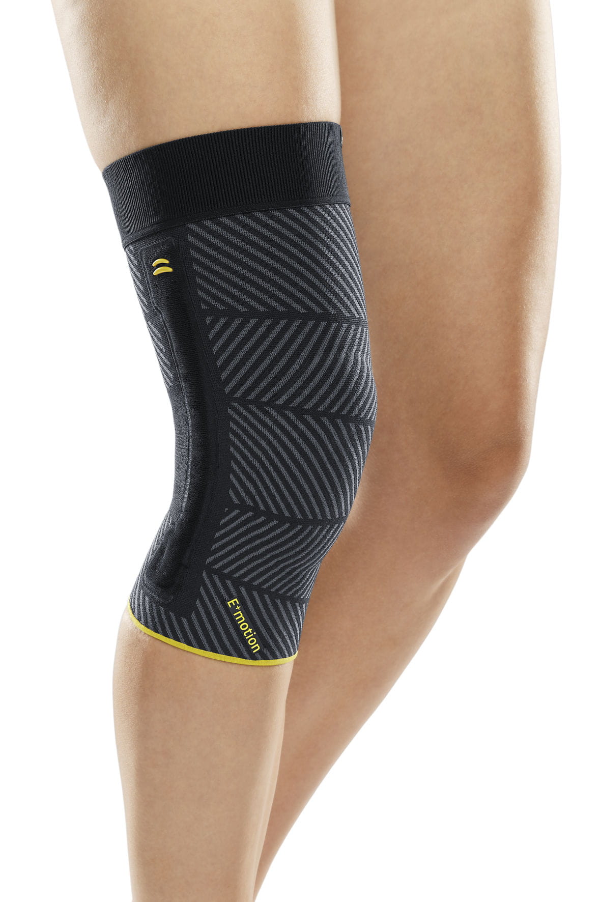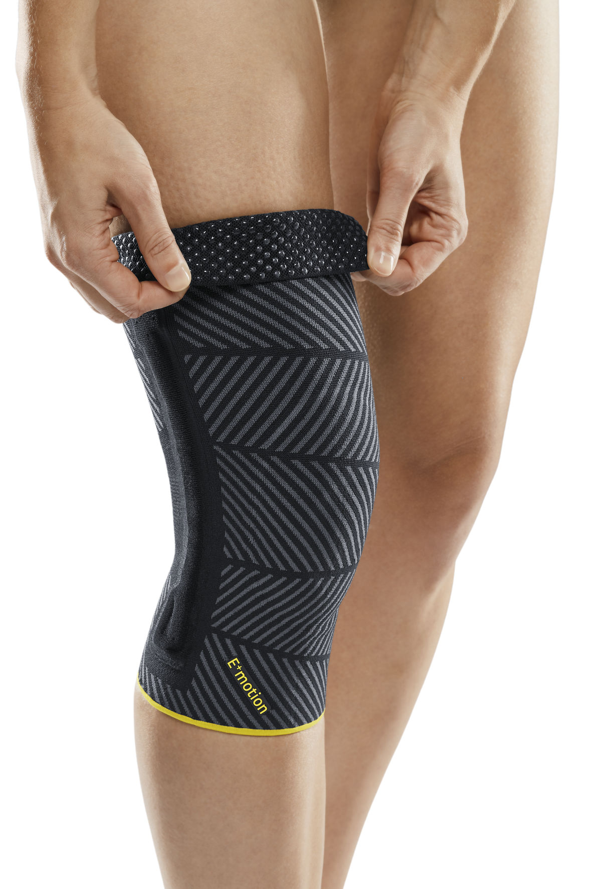 Sportowy stabilizator kolana o wysokim stopniu stabilności Genumedi E⁺motion 3.0, wykonany z unikatowej tkaniny 3D, z pierścieniem silikonowym oraz specjalną strefą komfortu pod kolanem