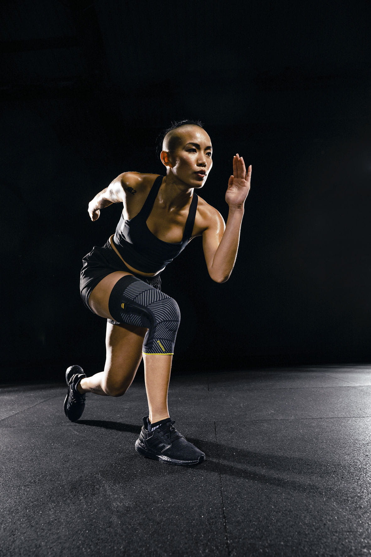- Wywiera ucisk na staw kolanowy, poprawiając jego funkcjonowanie w życiu codziennym i podczas aktywności sportowej