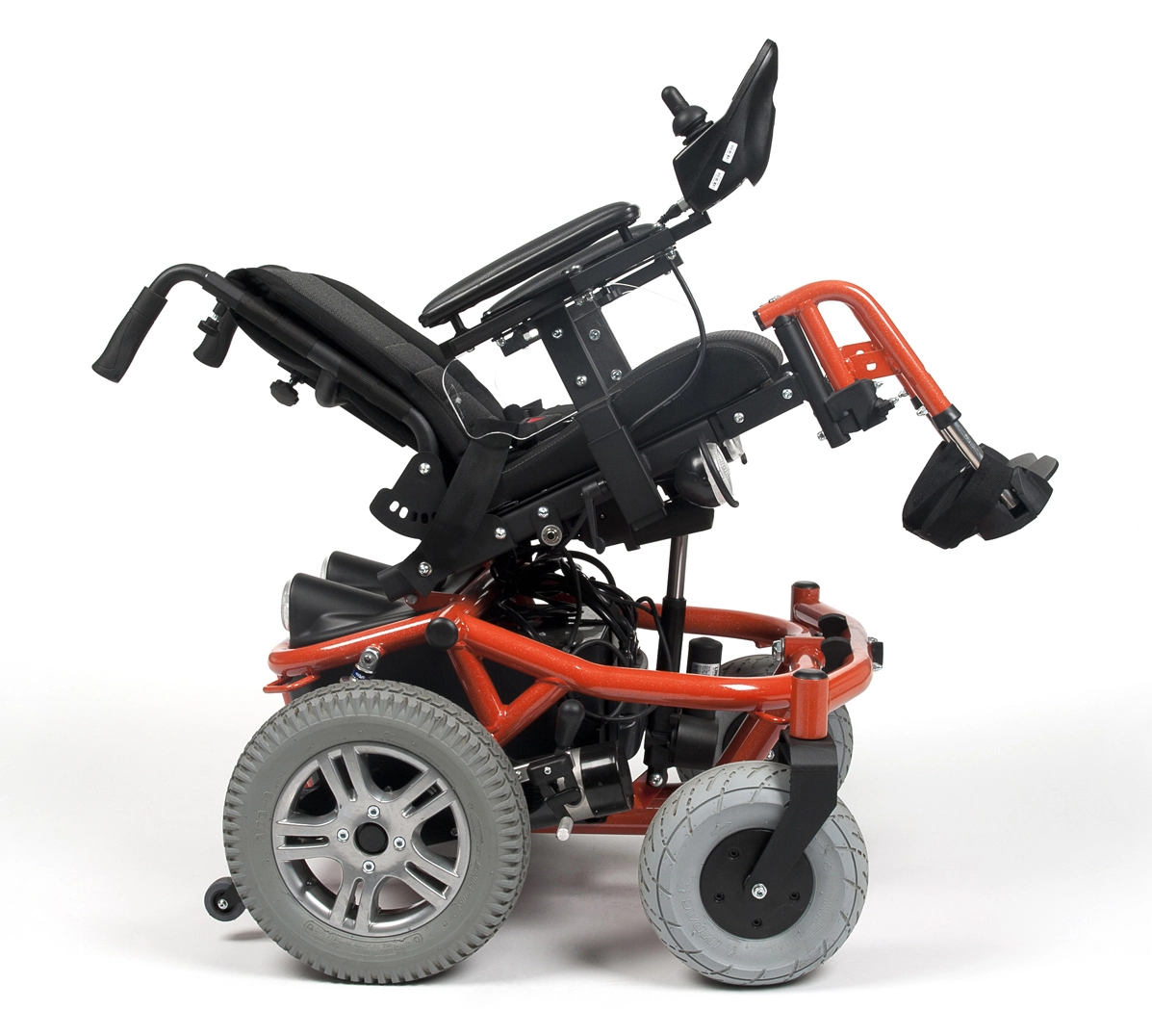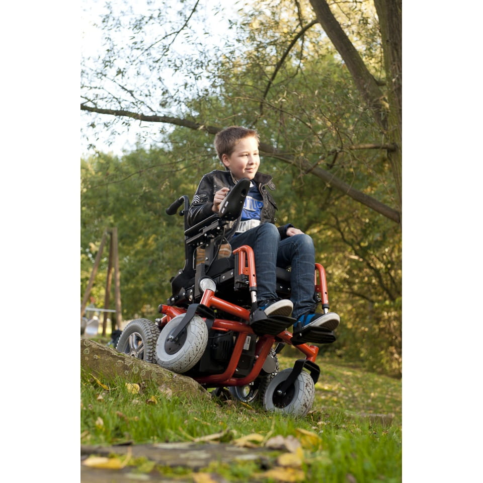 Wózek inwalidzki dziecięcy terenowo - pokojowy z napędem elektrycznym Forest Kids Vermeiren, z kółkami przeciwwywrotnymi na systemie ROSTA®, z zawieszeniem kół tylnych skonstruowanym na amortyzatorach z regulowanym skokiem