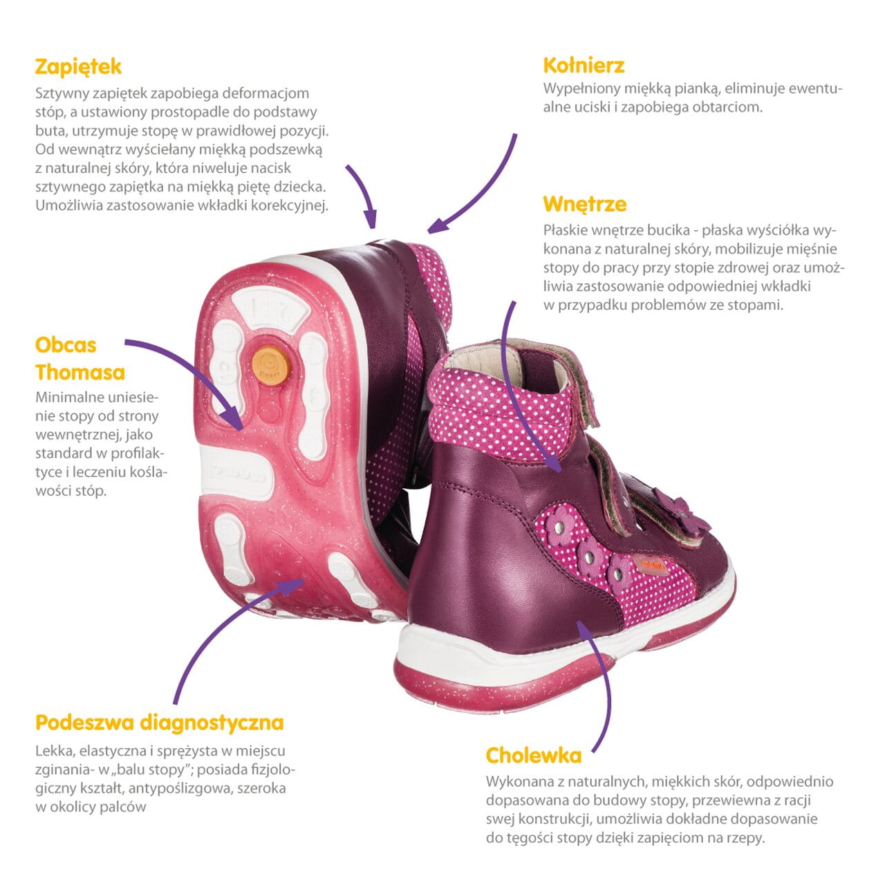 Buty Agnes to niezwykłe połączenie komfortu i właściwości prozdrowotnych. Wyjątkowa konstrukcja, obcas Thomasa, sztywny zapiętek i podeszwa diagnostyczna Memo gwarantują prawidłowy rozwój stóp Twojego dziecka. Idealne jako codzienne buty do szkoły czy buty korekcyjne dla przedszkolaków i uczniów. Otwarta konstrukcja cholewki zapewnia cyrkulację powietrza, a zapięcie na rzepy ułatwia zakładanie. Stylowa kompozycja kolorystyczna nadaje się idealnie dla dziewczynki a naturalne skóry dodają uroku. Przystosowane do wkładek ortopedycznych Memo.