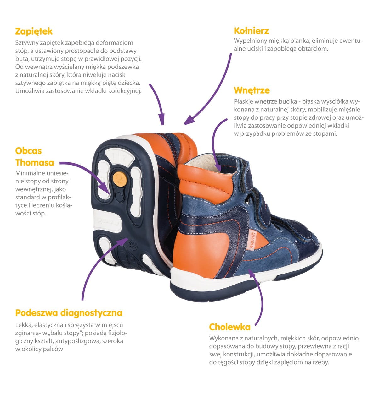 Obuwie zdrowotne dla dzieci stanowi istotny temat, którego znaczenie dla rozwoju najmłodszych nie może być lekceważone. Buty pełnią znaczącą rolę nie tylko w zapewnieniu komfortu i wygody, ale również w prawidłowym rozwoju stóp oraz całego układu kostno-mięśniowego. Buciki Memo to obuwie zdrowotne pełniące funkcję profilaktyczną, zapobiegając przede wszystkim rozwojowi wad postawy oraz powstawaniu płaskostopia i koślawości stóp oraz kolan u dzieci. Dzięki zastosowaniu unikatowych technologii buciki Memo gwarantują profesjonalne wsparcie i prawidłowy rozwój dziecięcych stóp.