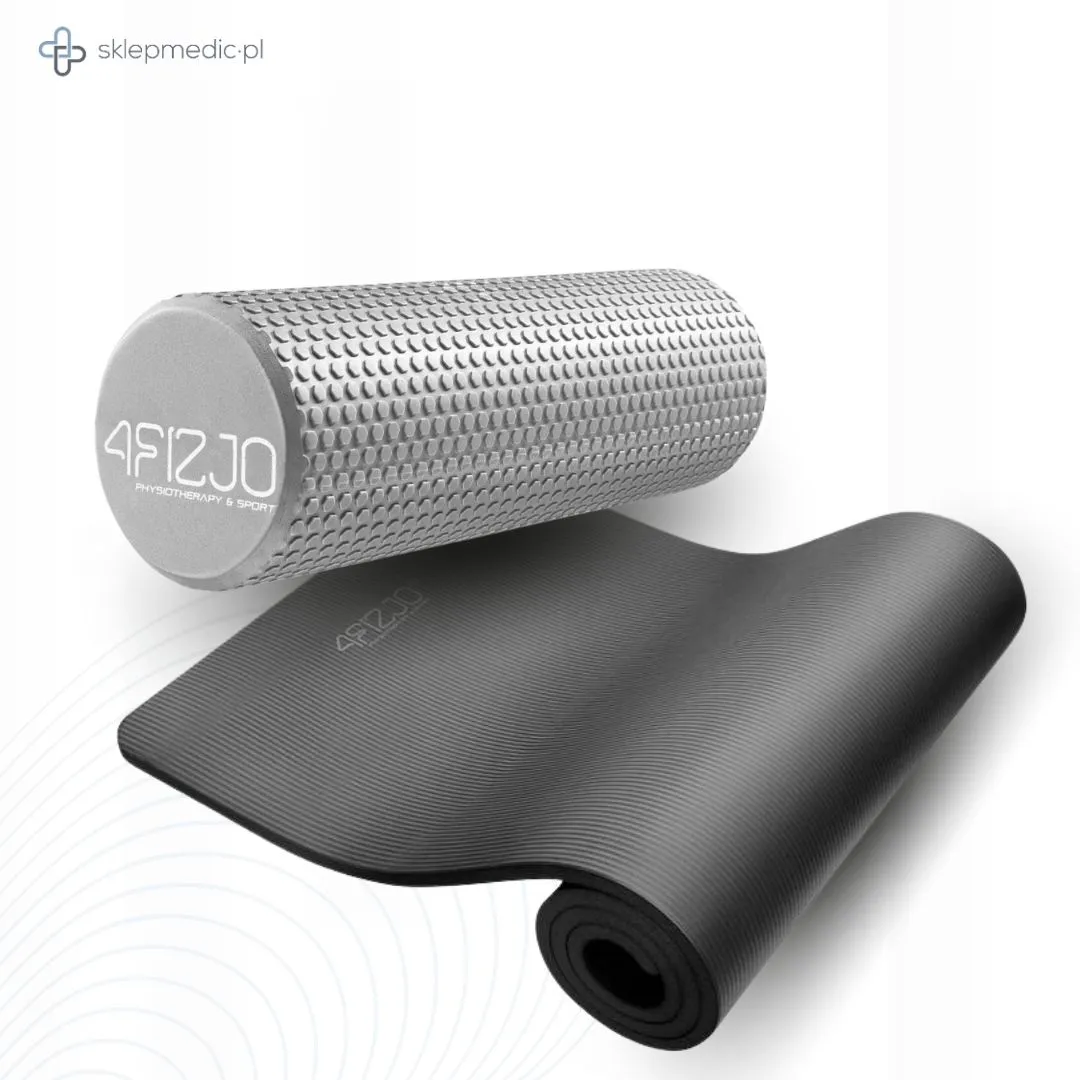 Zestaw promocyjny „Aktywna regeneracja” – gruba mata do ćwiczeń NBR 4FIZJO czarna (180×60×1,5 cm) + roller do masażu CARE+ 4FIZJO szary 45 cm