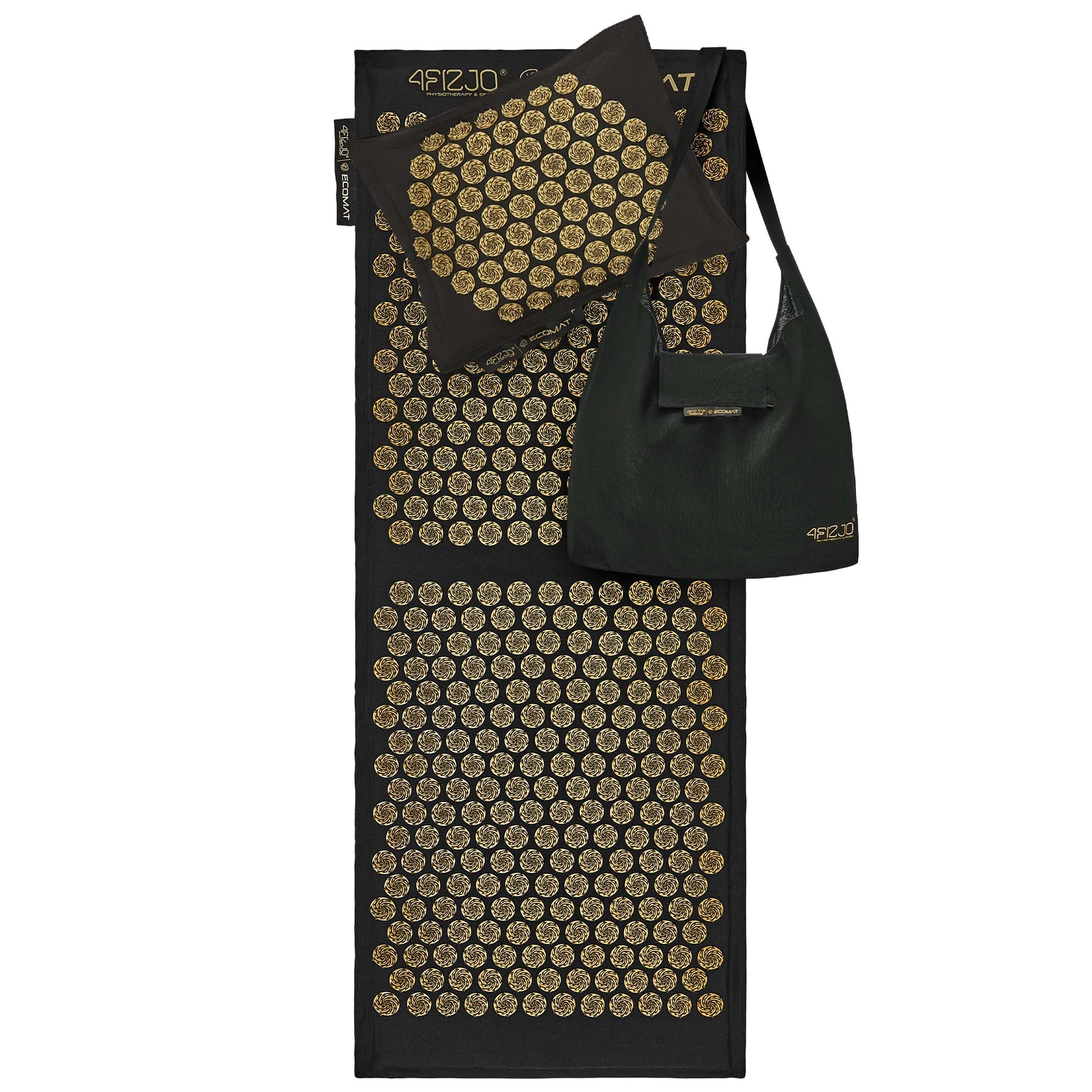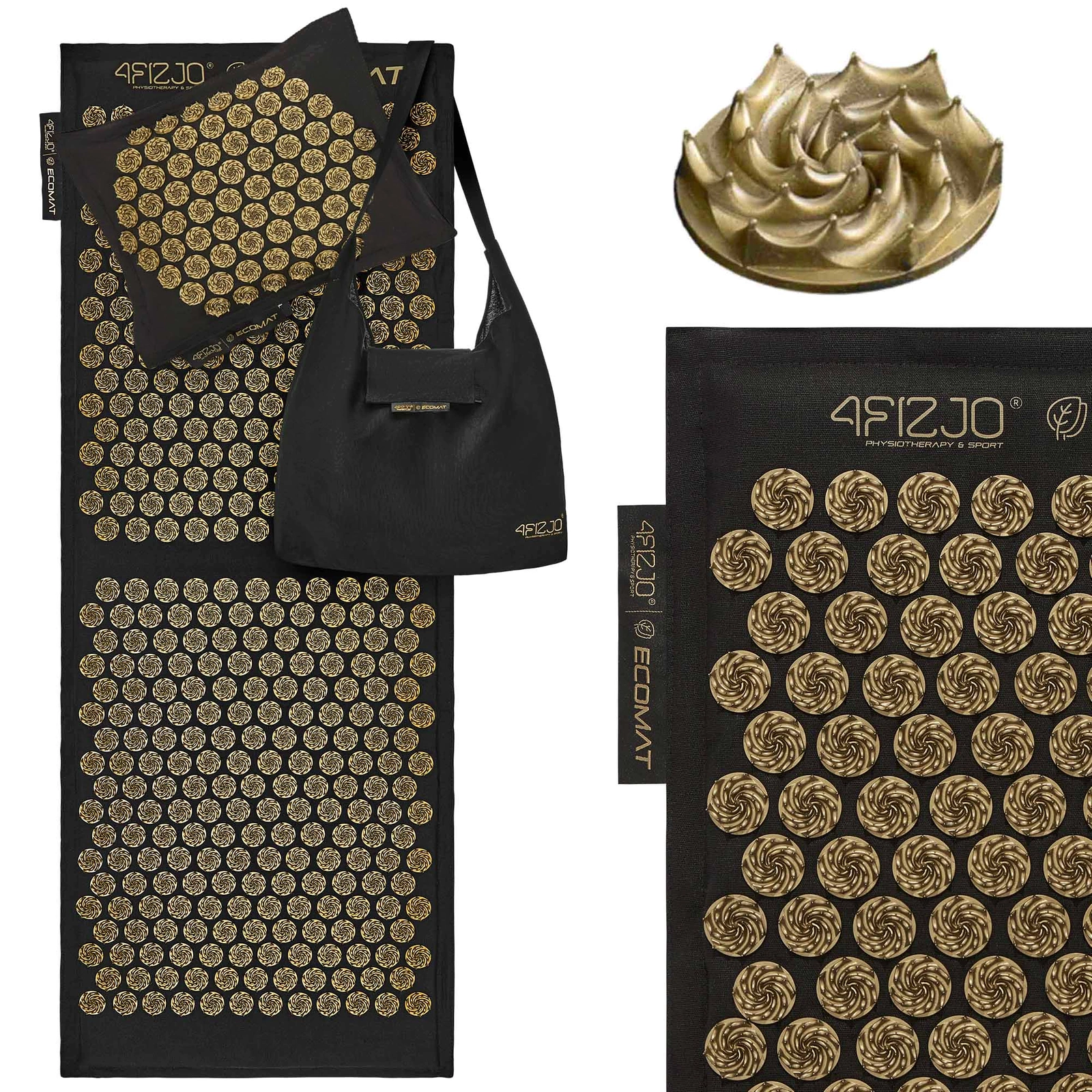 Duża ECO MATA do akupresury, z poduszką z łuskami gryki, z kolcami w technologii SPINNING SPIKES 110x42 (CZARNO-ZŁOTA)