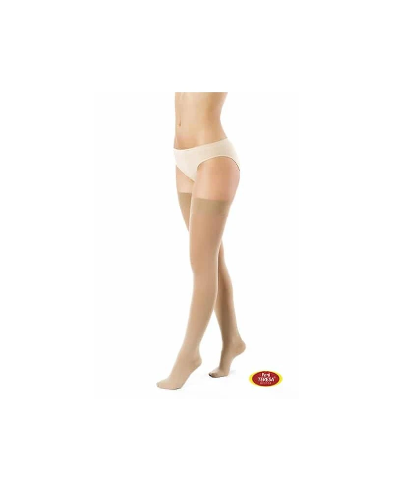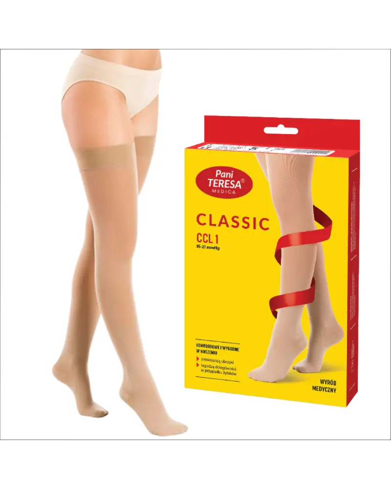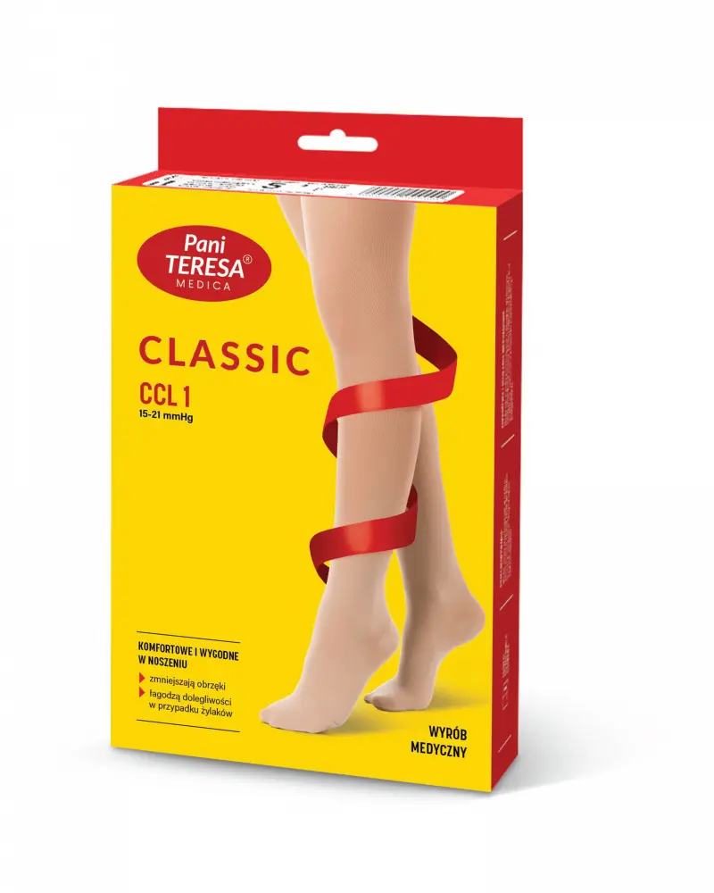 POŃCZOCHY MEDYCZNE UCISKOWE 1 KLASA KOMPRESJI to pończochy uciskowe przeznaczone dla osób z problemem puchnięcia nóg, obrzęków, pękaniem naczynek, żylaków gdy problem występuje na udzie lub w dole podkolanowym czy łydce. Dzięki stopniowanemu uciskowi zapewniają prawidłowy odpływ krwi żylnej, wspomagają pracę zastawek, zapobiegają tworzeniu się zastojów żylnych. Efektywny ucisk 1 klasy kompresji 15-21 mmHg, przy kostce jest największy, im bliżej pachwiny tym ucisk jest mniejszy. Pończochy wykonane są z elastycznej przędzy (poliamid 78%, elastan 22%), wykończone nie uciskowym, samonośnym mankietem, który zapobiega zsuwaniu się pończochy dzięki silikonowym paskom. Występują w długościach w zależności od wzrostu pacjenta – krótkie lub długie. Wyroby powinno zakładać się rano, po nocnym odpoczynku (można nogę unieść na kilka minut w górę, tak by limfa i krew spłynęły w stronę serca) i nosić cały dzień. Do zakładania można użyć gumowych rękawiczek. Dobór siły ucisku, rodzaj produktu należy ustalić z lekarzem. W celu doboru prawidłowego rozmiaru należy zmierzyć obwody nóg w miejscach wskazanych w tabeli rozmiarów. Pomiaru najlepiej dokonać rano, po wypoczynku, gdy nogi nie są spuchnięte. Występują dwóch długościach w zależności od wzrostu pacjenta – krótkie lub długie, w wersji z czubkiem otwartym lub zamkniętym, w czterech rozmiarach.