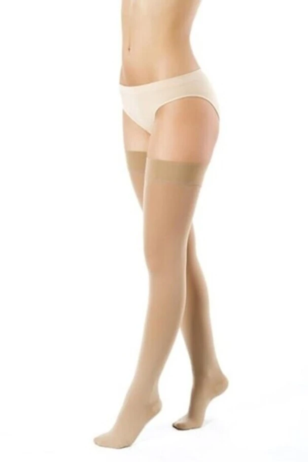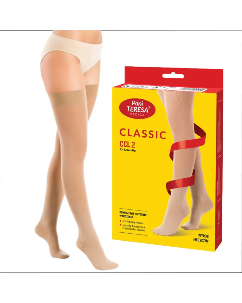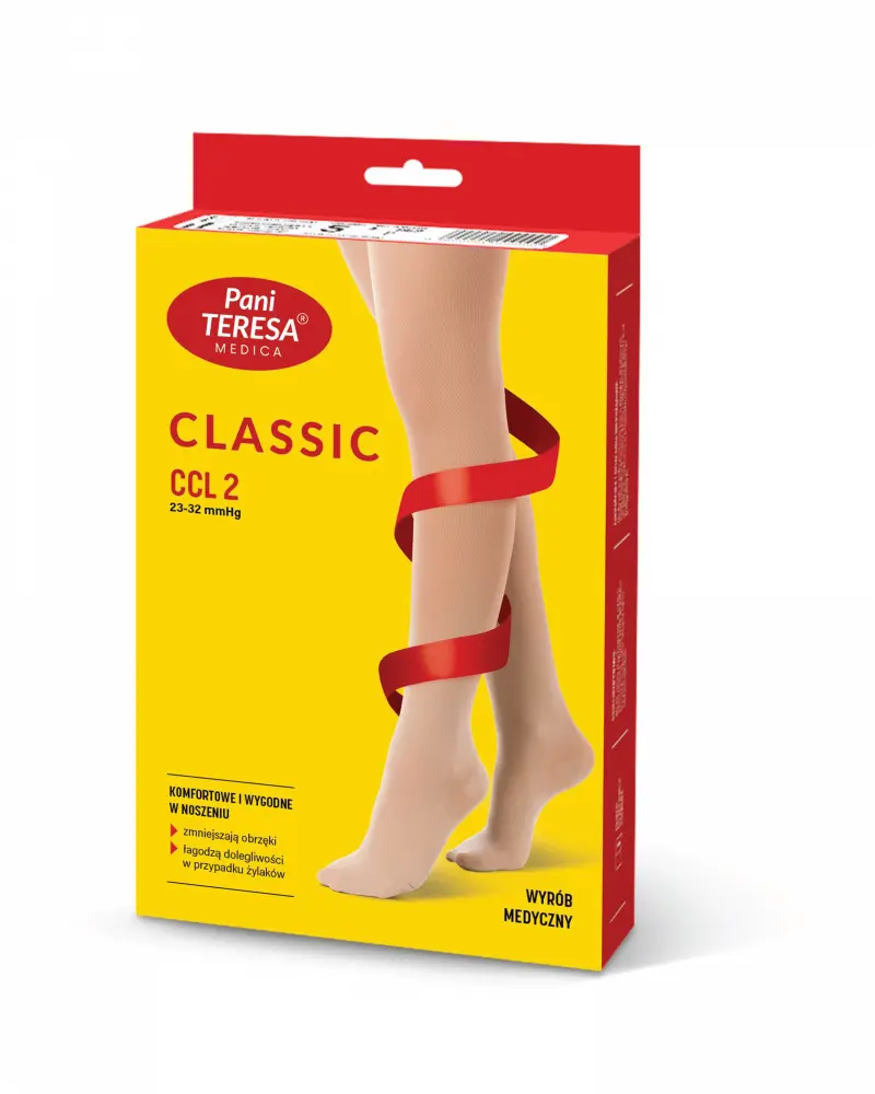 POŃCZOCHY MEDYCZNE UCISKOWE 2 klasa kompresji to pończochy uciskowe przeznaczone dla osób z problemem puchnięcia nóg, obrzęków, pękaniem naczynek, żylaków gdy problem występuje na udzie lub w dole podkolanowym czy łydce. Dzięki stopniowanemu uciskowi zapewniają prawidłowy odpływ krwi żylnej, wspomagają pracę zastawek, zapobiegają tworzeniu się zastojów żylnych. Efektywny ucisk 2 klasy kompresji 23-32 mmHg, przy kostce jest największy, im bliżej pachwiny tym ucisk jest mniejszy. Pończochy wykonane są z elastycznej przędzy (poliamid 79%, elastan 21%), wykończone nie uciskowym, samonośnym mankietem, który zapobiega zsuwaniu się pończochy dzięki silikonowym paskom. Występują w dwóch długościach w zależności od wzrostu pacjenta – krótkie lub długie. Wyroby powinno zakładać się rano, po nocnym odpoczynku (można nogę unieść na kilka minut w górę, tak by limfa i krew spłynęły w stronę serca) i nosić cały dzień. Do zakładania można użyć gumowych rękawiczek. Dobór siły ucisku, rodzaj produktu należy ustalić z lekarzem. W celu doboru prawidłowego rozmiaru należy zmierzyć obwody nóg w miejscach wskazanych w tabeli rozmiarów. Pomiaru najlepiej dokonać rano, po wypoczynku, gdy nogi nie są spuchnięte.