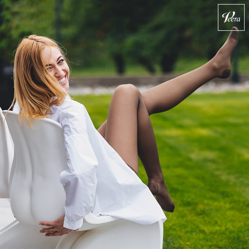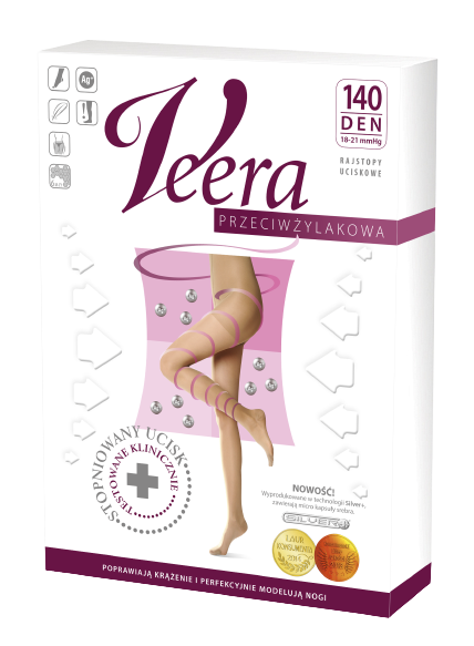 RAJSTOPY UCISKOWE Veera 140 den - 1 klasa ucisku to profilaktyczne rajstopy uciskowe przeznaczone dla osób z pierwszymi zmianami żylnymi, pękającymi naczynkami, „pajączkami”, ciągłym bólem nóg, bolącymi i spuchniętymi nogami, gdy obrzęk w okolicy kostki nie ustępuje po przespanej nocy. Eleganckie produkty Veera ze stopniowanym uciskiem nie tylko poprawiają krążenie, ale i modelują nogi. Ich regularne stosowanie daje ulgę zmęczonym nogom oraz skutecznie niwelują pierwsze objawy osłabionego krążenia. Ucisk 1 klasy kompresji 18-21 mmHg, przy kostce jest największy, im bliżej pachwiny tym ucisk jest mniejszy. Rajstopy wykonane są z elastycznej przędzy (poliamid 78%, elastan 22%), o splocie plastra miodu, wykończone nie uciskową częścią majtkową. Wzbogacone są w jony srebra dające świeżość, właściwości antybakteryjne i grzybobójcze. Występują w wersji z czubkiem zamkniętym, mają wzmocnione pięty i palce, dzięki czemu są trwałe i odpowiednio układają się na nodze. Wyroby powinno zakładać się rano, po nocnym odpoczynku (można nogę unieść na kilka minut w górę, tak by limfa i krew spłynęły w stronę serca) i nosić cały dzień. Do zakładania można użyć gumowych rękawiczek.