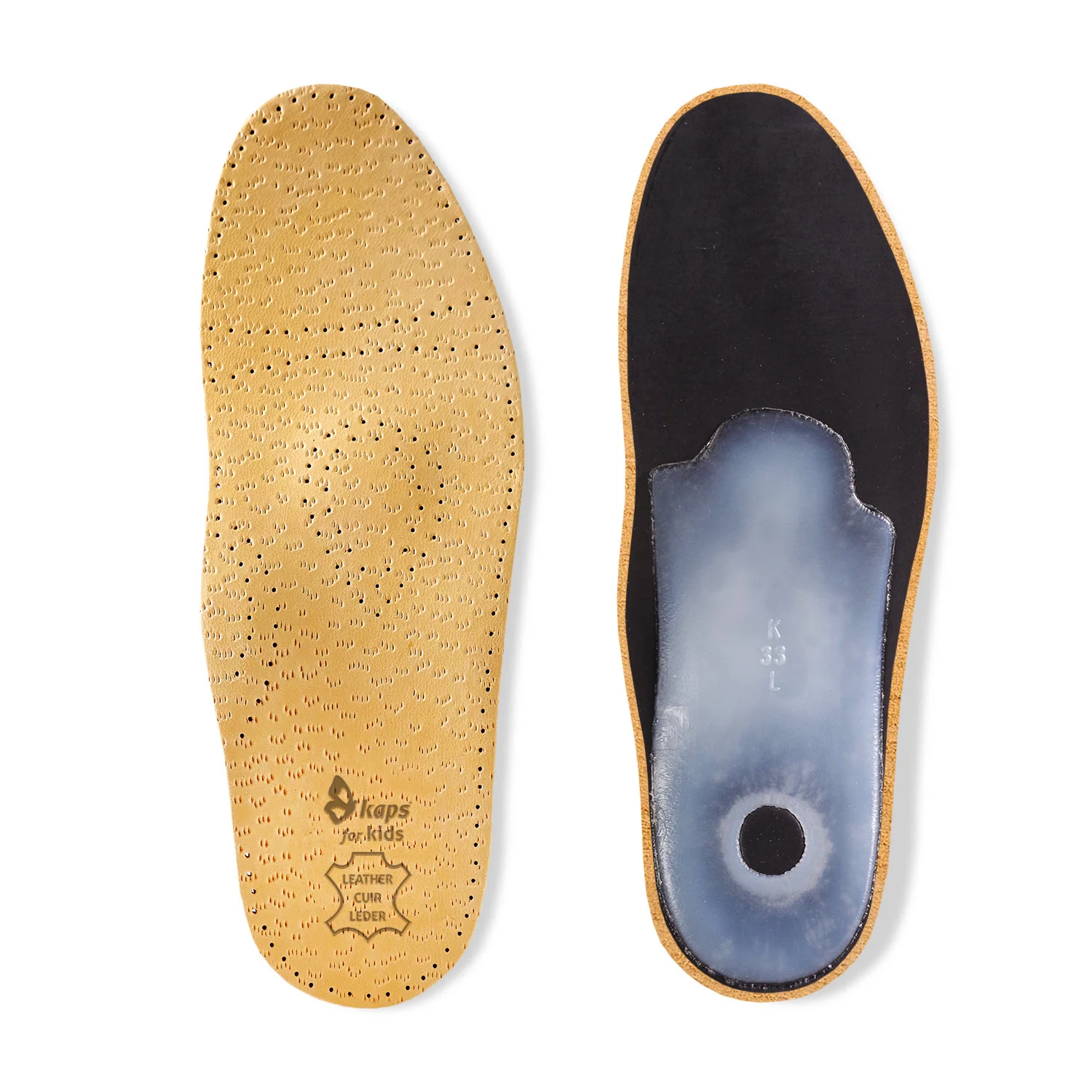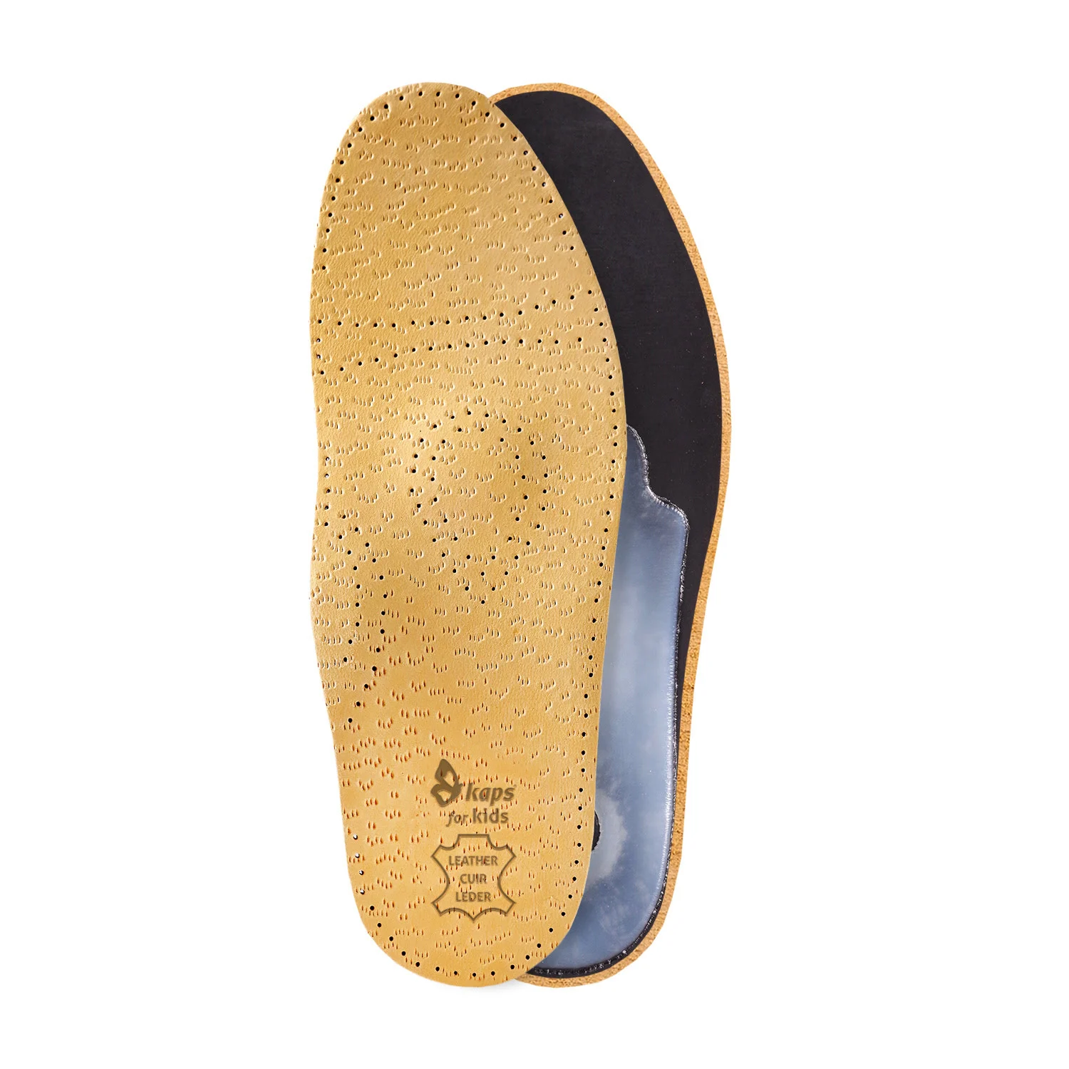 Komfortowe dziecięce wkładki ortopedyczne Relax Kids by Kaps® wykonane ze skóry naturalnej, profilowanego tworzywa i pianki lateksowej z węglem aktywnym, doskonale podpierają sklepienie podłużne stóp dzieci