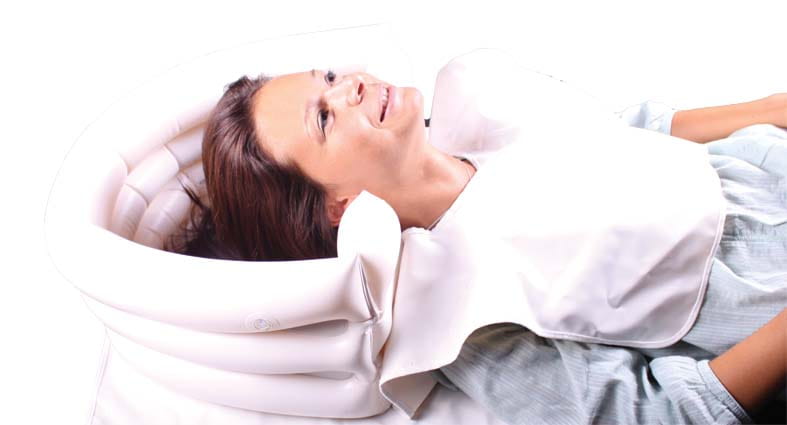 Nadmuchiwany basen z odpływem oraz zasobnik na wodę i słuchawka prysznicowa tworzą zestaw do mycia głowy w pozycji leżącej. Przeznaczony dla osób długotrwale leżących w warunkach domowych lub w podróży. Basen pompuje się ustami. Wykonany jest z trwałego, nieprzemakalnego materiału. Jeden z boków basenu jest obniżony i wyprofilowany pod szyję pacjenta dla większego komfortu użytkowania. Kładzie się na nim głowę pacjenta. Po nalaniu wody do zasobnika (8l) należy go zawiesić np. na stojaku na kroplówki czy wieszaku. Z zasobnika woda płynąc przez wężyk (50 cm) trafia do słuchawki prysznicowej, która daje szeroki, wygodny strumień wody. Przepływ wody jest regulowany zaworem.Po umyciu głowy, basen można łatwo opróżnić bez ryzyka rozlania się wody wylewając ją np. do wiaderka przy pomocy wężyka odpływowego.